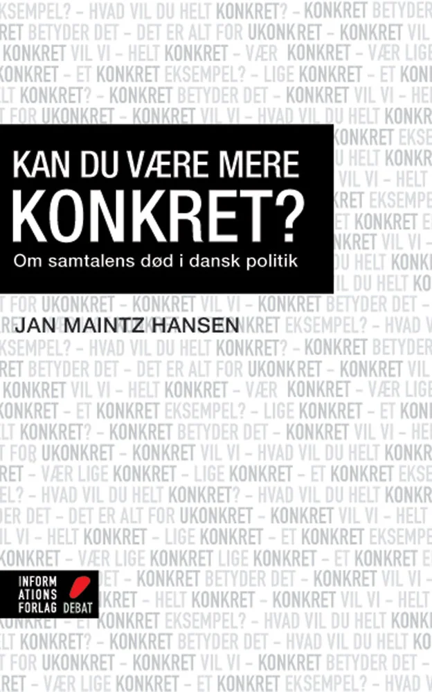 I KAN DU VÆRE MERE KONKRET? fremsætter Jan Maintz Hansen en skarp og original kritik af dansk politik, som han mener befinder sig i en sørgelig forfatning. Dansk politik udspiller sig på en frustreren...Forlagsbeskrivelse af Kan du være mere konkret? af Jan Maintz Hansen