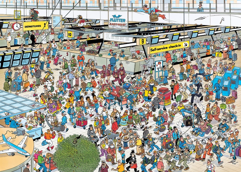 Puslespil med sjovt og detaljeret motiv. Jan Van Haasteren er kendt for at skabe billeder, hvor øjnene virkelig kan gå på opdagelse i et væld af humoristiske scenarier og detaljer - puslespillet her er ingen undtagelse. Måler 68 x 49 cm