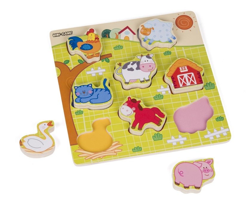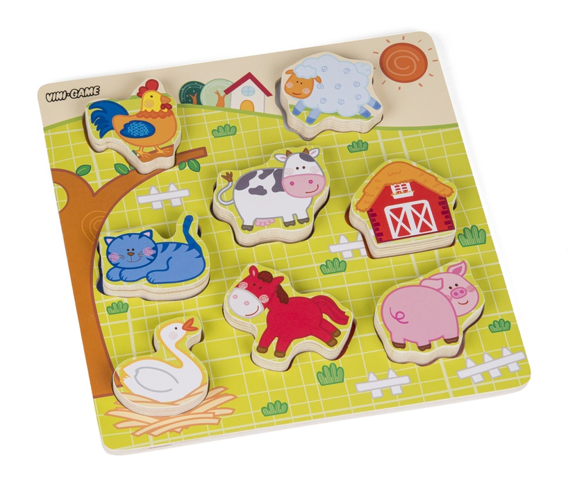 Træpuslespil med tykke brikker 22,5x22,5 cm. Vælg mellem version med bondegårdsdyr eller vilde dyr.