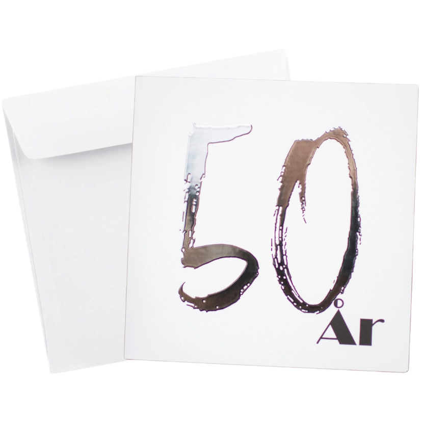 Dobbeltsidet foldet minimalistisk fødselsdags- og jubilæumskort med teksten '50 år' på en hvid baggrund, der er printet på 250gr karton med mat overflade. Derudover er tallet '50' påtrykt som en sølv folie detalje ovenpå, der giver en ekstra dimension og shine til kortet. Der medfølger én hvid konvolut pr. kort.
