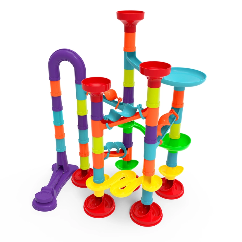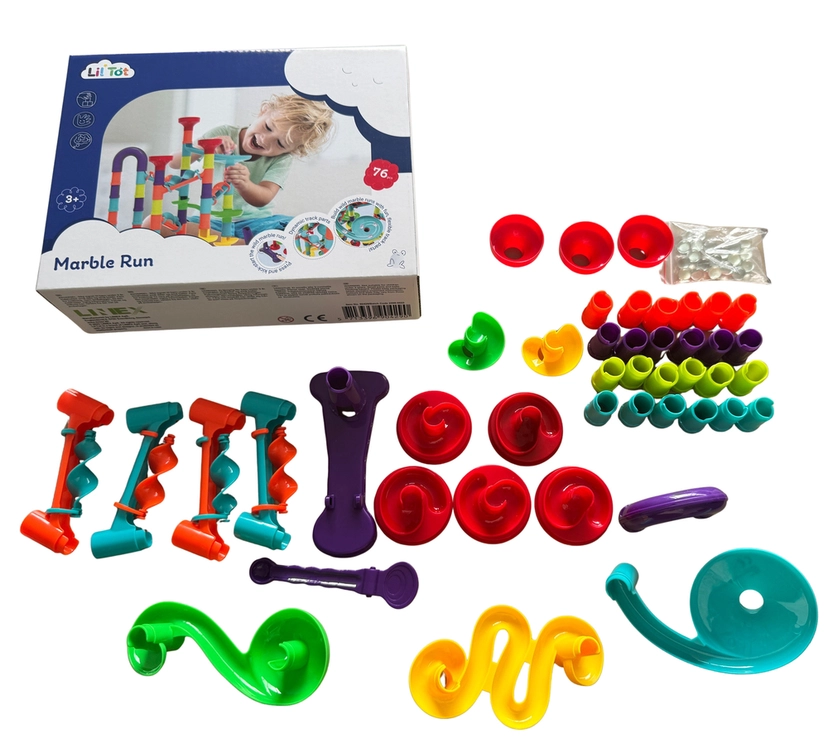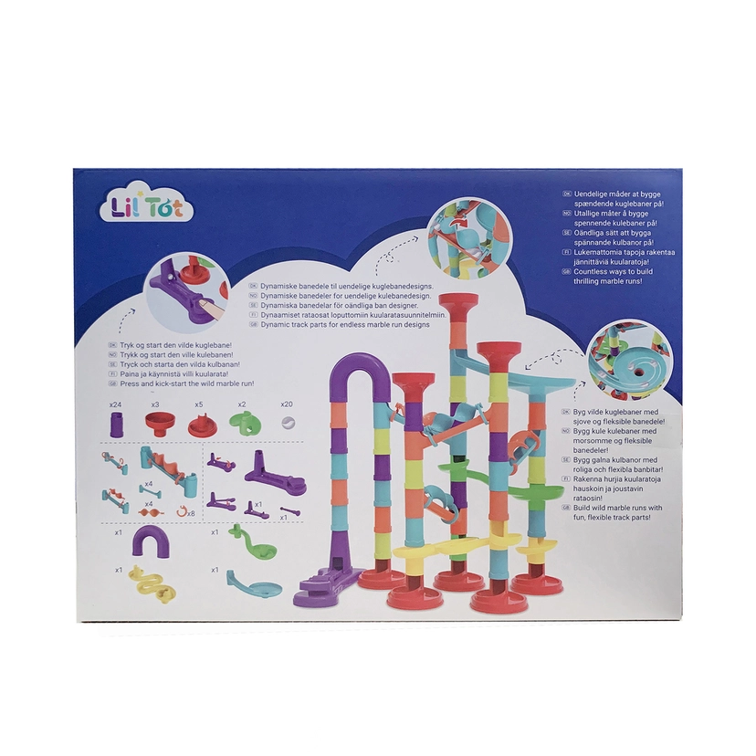 Byg din egen seje kuglebane fra Lil'Tot, og lad marmorkuglerne rulle gennem alle de sjove forhindringer og sving, du selv har konstrueret! Med 76 farverige og fleksible dele kan du skabe vilde og fantasifulde baner igen og igen.
