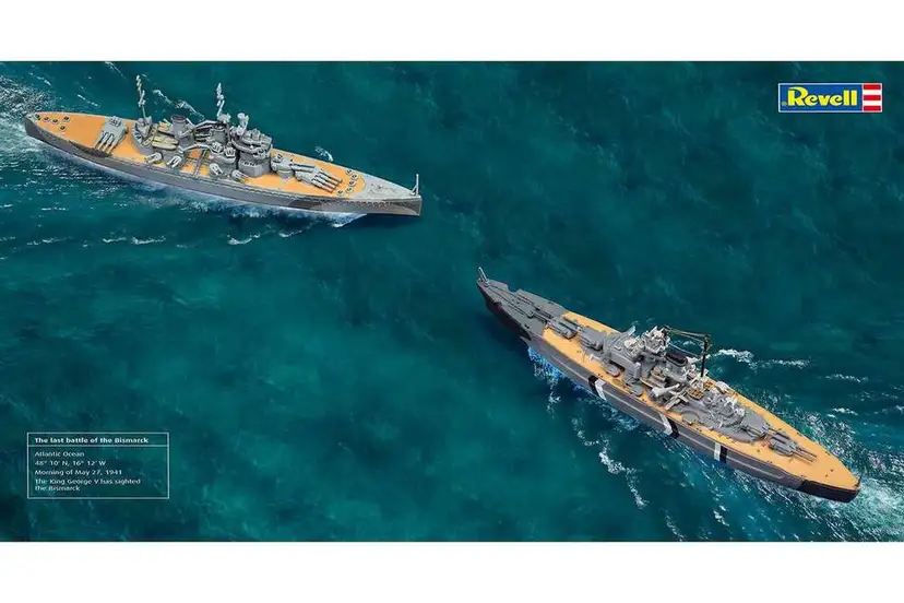 Det sidste slag ved Bismarck. I 1941 mødtes to giganter i Atlanterhavet - HMS King George V og Bismarck. - Sættet inkluderer sæt af begge slagskibe. - 2 basisfarver, lim og børster - samt en plakatbase til at genskabe søslaget