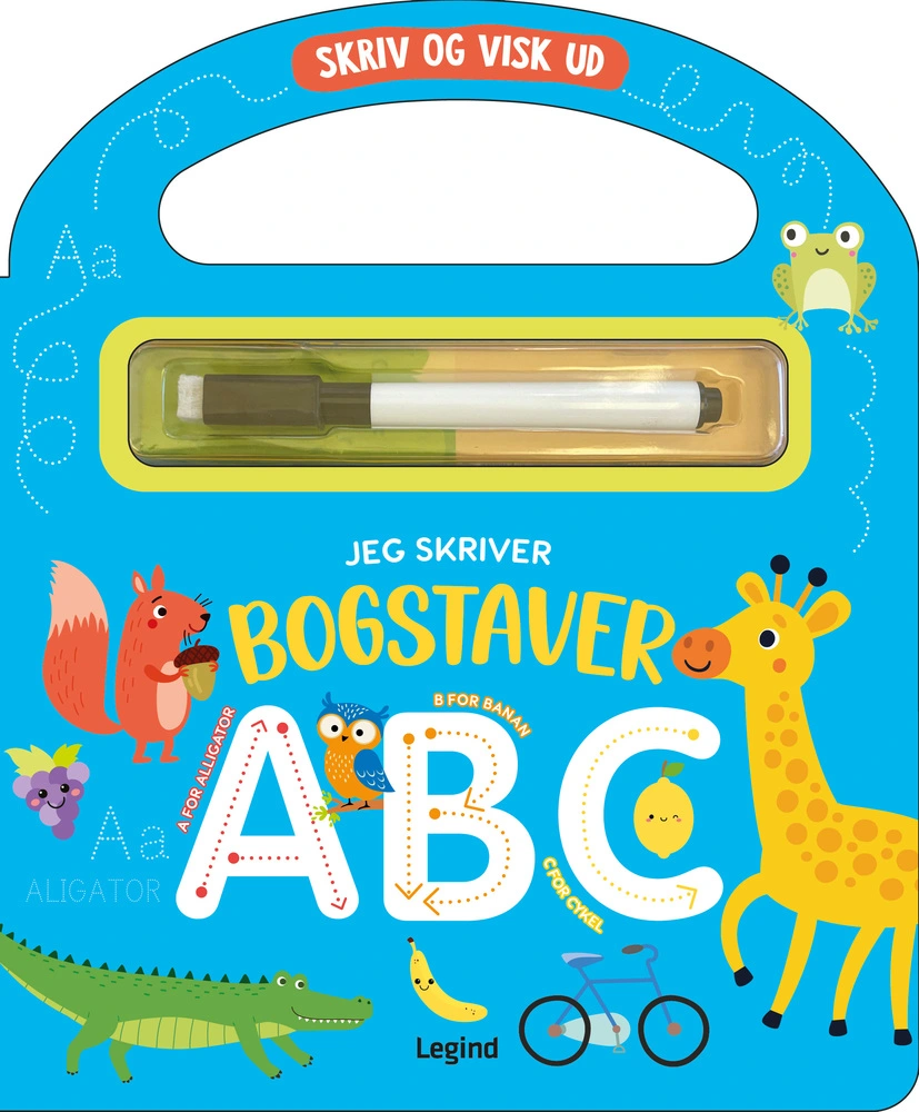 Kan du alle bogstaverne? Ellers kan du starte her. Prøv, skriv, visk ud, og prøv igen - lige så mange gange, du vil.Leg og lærBog med praktisk håndtagPennen følger med