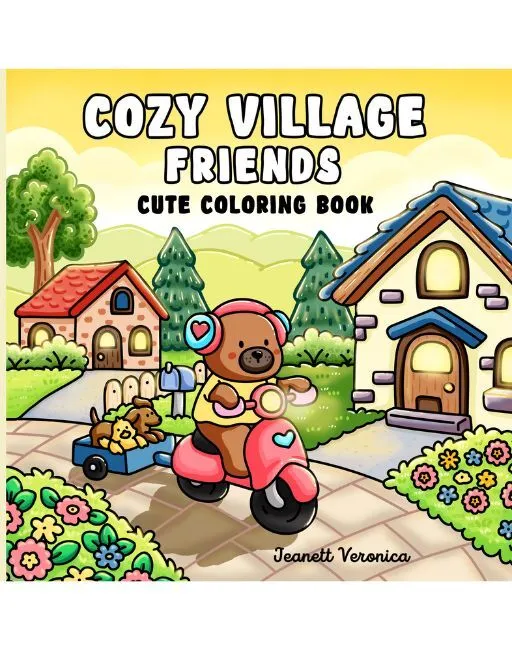 Cozy Village Friends er skabt af den danske forfatter Jeanett Veronica, som står bag et af de mest populære malebogsbrands på Amazon.com. Malebogen inviterer dig ind i en hyggelig lille landsby fyldt med charmerende huse, små butikker og søde dyrevenner, der lever side om side.