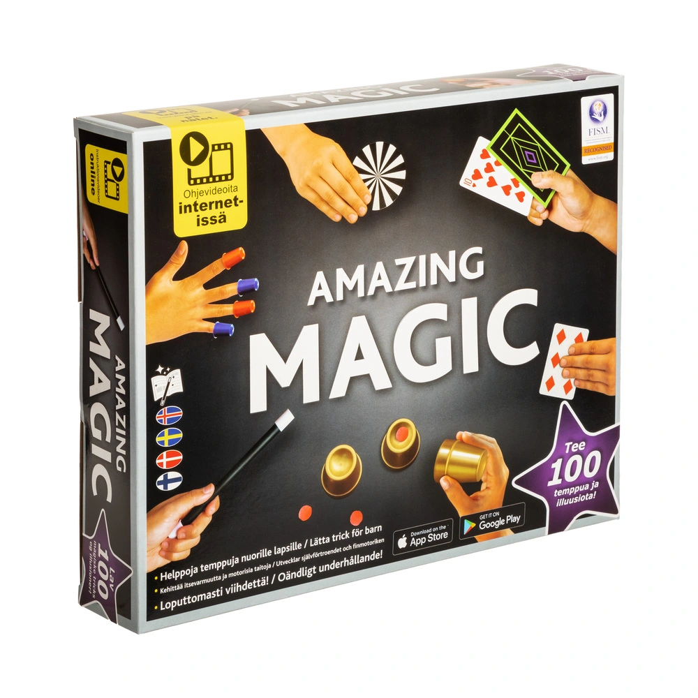 Magisk tryllesæt til børn med 100 tricks og illusioner! Imponerende og sjove trylletricks der kan læres på få minutter. Øv dig og vis blændende korttricks frem, få mønterne til at formere sig eller tryll dem ud af ingenting! Genstande forsvinder fra dine hænder, de dukker op igen, og nogle af dem bliver til noget andet. Klassiske tricks med bolde og kopper og meget, meget mere. Indeholder tilbehør og trin-for-trin instruktioner på dansk, norsk, svensk og finsk.
