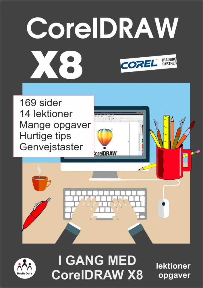 Kom godt i gang med CorelDRAW. Bogen indeholder 14 lektioner, mange opgaver, en sektion med hurtige tips og tricks samt en liste over de mest vigtige genvejstaster. Bogen er skrevet enkelt og med henblik på praktisk brug af CorelDRAW. Public Data er certificeret Corel Training Partner. Indhold: Introduktion, Basis viden, Håndter objekter, Linealer & guidelines, Farver & paletter, Lag & Object manager, Sideopsætning, Grundfigurer, Kombiner & Form, Præcis Placering & Fordeling, Tekst, Udskriv Tilpas CorelDRAW, Powerclip, Fjern baggrund.
